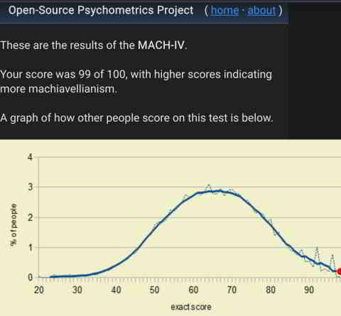 [ MACHIAVELLI-TEST FAST ERFOLGREICH]Auf > https://openpsychometrics.org/tests/MACH-IV/} < kann man prüfen, inwiefern man zu machiavellistischem Verhalten neigt. Je höher der Wert, desto eher richtet man das eigene Handeln am Nutzen aus als an irgendwelchen schwachsinnigen Moralvorstellungen. Das Ergebnis unseres großen Führers kann sich sehen lassen. Woher allerdings die kleine Schwäche von nur 99 % rührt, ist ungewiß. Bereits Aristoteles befand, daß es selbst im Hirn des weisesten Mannes immer einen törichten Winkel gebe.