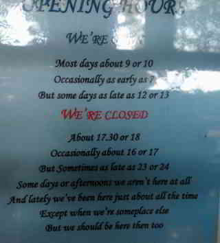 Ein beredtes Zeugnis der italienischen Art gibt folgende Öffnungszeitentafel in einem heruntergekommenen Urlauberort